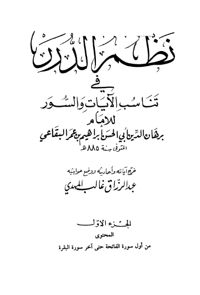 كتاب الغسل من شرح المهذب : ويحرم تفسيره بغير علم والكلام في معانيه لمن ليس من أهله ، وهذا مجمع عليه ، وأما تفسير العلماء فحسن بالإجماع ، فأمدني فيه والحمد الله تأييد سماوي فجعلته كالرديف لتفسير القاضي ناصر الدين البيضاوي(١) ، ولعل تسهيله كان ببركة مبشرة من آثار النبوة رأيتها في صباي وأنا في حدود العاشرة من سني في قريتنا من بلاد البقاع ، رأيت روح القدس جبريل المنزل لهذا الروح والمؤيد بروح القدس محمدا النبي المنزل عليه هذا الروحصلى‌الله‌عليه‌وسلم في صورتي شابين أمردين في أحسن صورة راكبين فرسين أخضرين في غاية الحسن متوجهين نحو المشرق ؛ فأيدني الله ببركتهما ، في تفسيره وتصنيفه بروح منه ، كما يشهده من طالعه وتدبره. والله ولي التوفيق! وسميته «نظم الدرر في تناسب الآيات والسور» ويناسب أن يسمى «فتح الرحمن في تناسب أجزاء القرآن» وأنسب الأسماء له «ترجمان القرآن ومبدى مناسبات الفرقان». وعلم المناسبات الأهم من مناسبات القرآن وغيره علم تعرف منه علل الترتيب. وموضوعه أجزاء الشيء المطلوب علم مناسبته من حيث الترتيب ، وثمرته الاطلاع على الرتبة التي يستحقها الجزء بسبب ما له بما وراءه وما أمامه من الارتباط والتعلق الذي هو كلحمة النسب ، فعلم مناسبات القرآن علم تعرف منه علل ترتيب أجزائه ، وهو سر البلاغة لأدائه إلى تحقيق مطابقة المعاني لما اقتضاه من الحال ، وتتوقف الإجادة فيه على معرفة مقصود السورة المطلوب ذلك فيها. ويفيد ذلك معرفة المقصود من جميع جملها ؛ فلذلك كان هذا العلم في غاية النفاسة وكانت نسبته من علم التفسير نسبة علم البيان من النحو. وطالعت على ذلك كتاب العلامة أبي جعفر أحمد بن إبراهيم بن الزبير الثقفي(٢) العاصمي الأندلسي «المعلم بالبرهان في ترتيب سور القرآن» وهو لبيان مناسبة تعقيب السورة بالسورة فقط ، لا يتعرض فيه للآيات ، وسأذكر في أول كل سورة ما قاله فيها بلفظه ، كما ستراه إن شاء الله تعالى ، ثم ظفرت بكتاب الإمام بدر الدين محمد بن عبد الله(٣) الزركشي المصري الشافعي سماه «البرهان في علوم القرآن» فرأيته ذكر فيه ما يعرف بمقدار كتابي هذا فقال في النوع الثاني منه : وهو في المناسبة قد قل اعتناء المفسرين بهذا النوع لدقته ، وممن أكثر منه الإمام فخر الدين وقال في تفسيره : أكثر